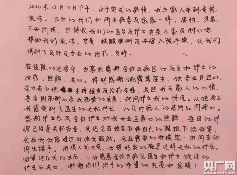 12月16日,一妇婴西院产科五病区收到一封来自患者小妍(化名)的感谢信,言辞恳切。“每日的护理现已是关怀备至,还会在查看时将自己的鞋脱下来给我穿,会在我失落难过期给我鼓舞,会在需求的时分榜首时间自动伸出援手。所谓人世大爱,我想描述的便是这样忘我的支付。”