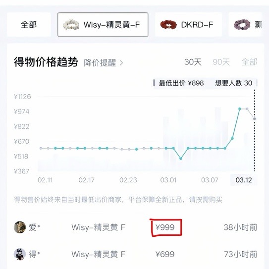 得物App显现,该款发圈有较高的商场溢价,标价飙涨至数百元。“精灵黄”色款价格更是被炒至999元,较原价溢价超12倍。