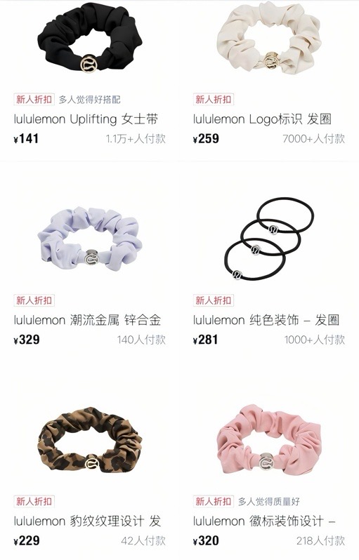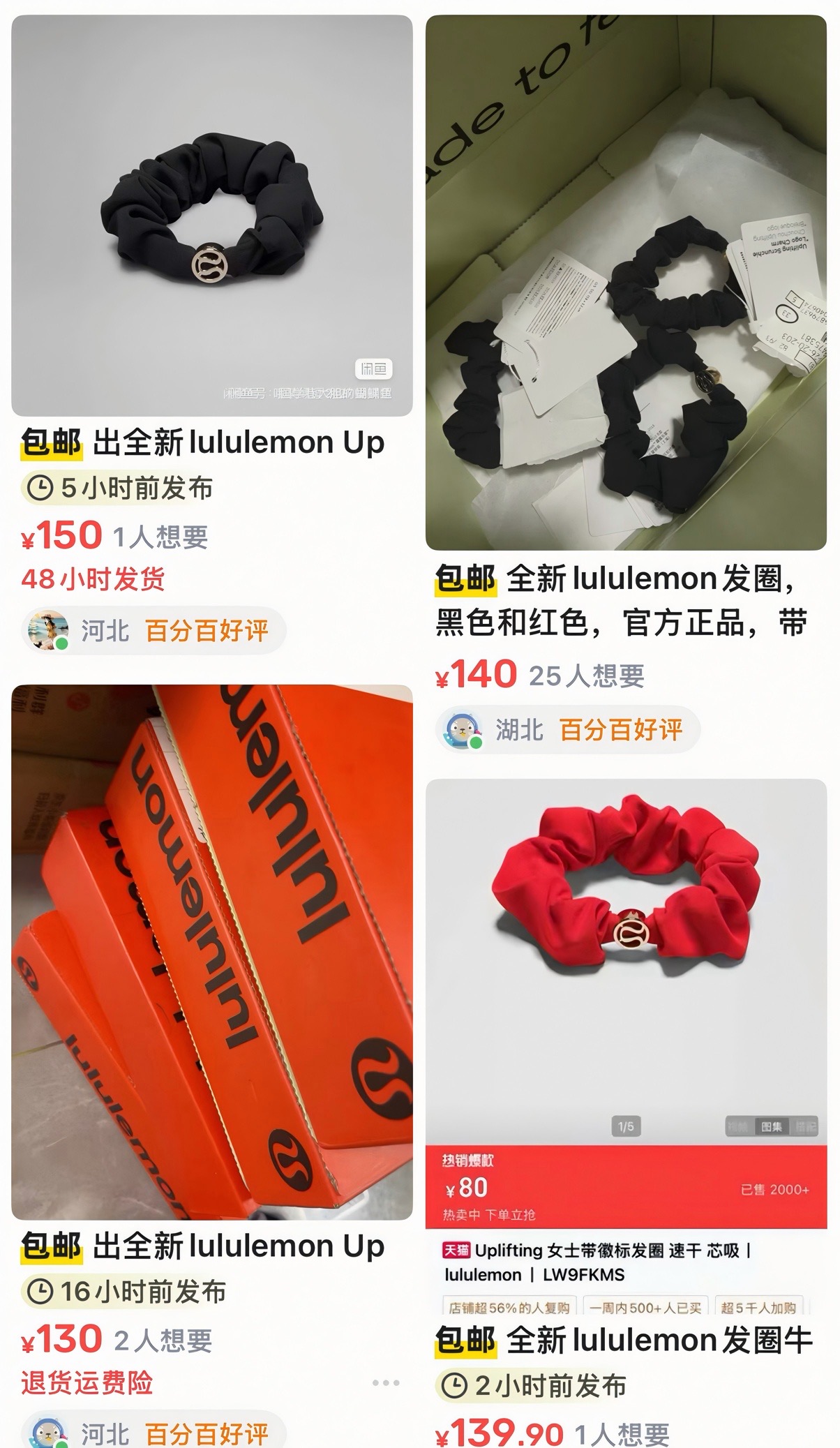 值得注意的是,Lululemon线上旗舰店内还有多款高价发圈产品,如180元3只装的带徽标发绳、220元3只装的带挂坠发绳等,定价均远超一般饰品,且二手渠道也存在溢价售卖的状况。